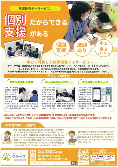 千葉県をはじめ、全国各地で子どもたち一人ひとりの個性を育む「個別支援」を行う放課後等デイサービスクラップが、4月より大曲駅前にオープンします!